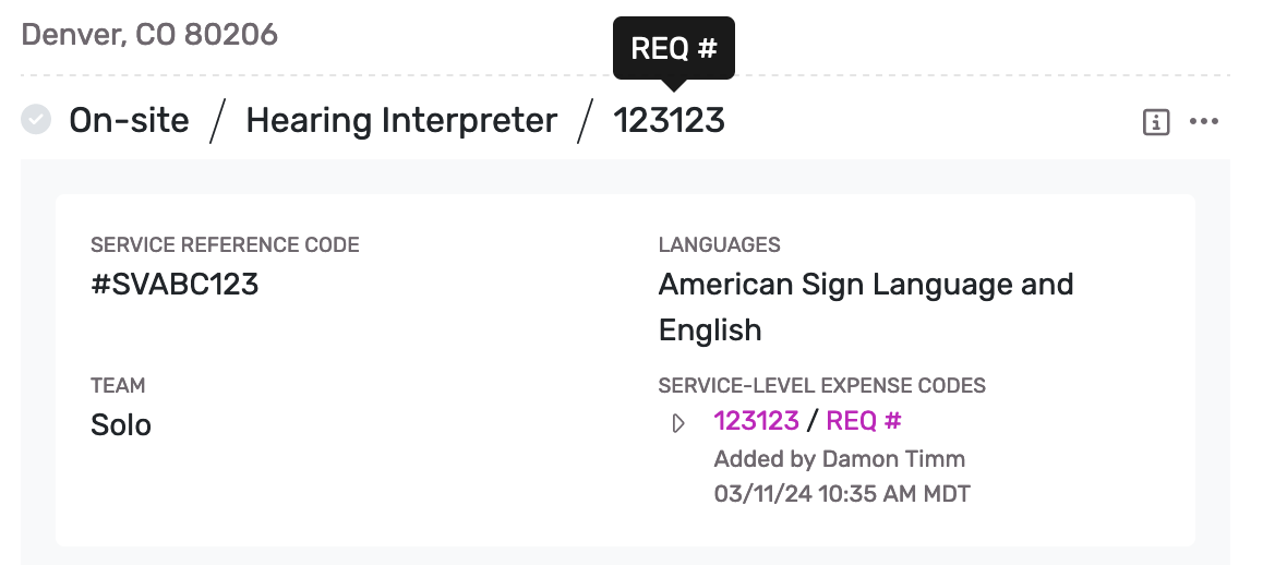 Most customers apply expense codes at the request-level; however, you can also add a separate expense code for every service in a request by selecting `Edit expense code` from the contextual menu next to the service details. You can see the code appended to the end of the service line or if you expand the service details using the `[i]`.